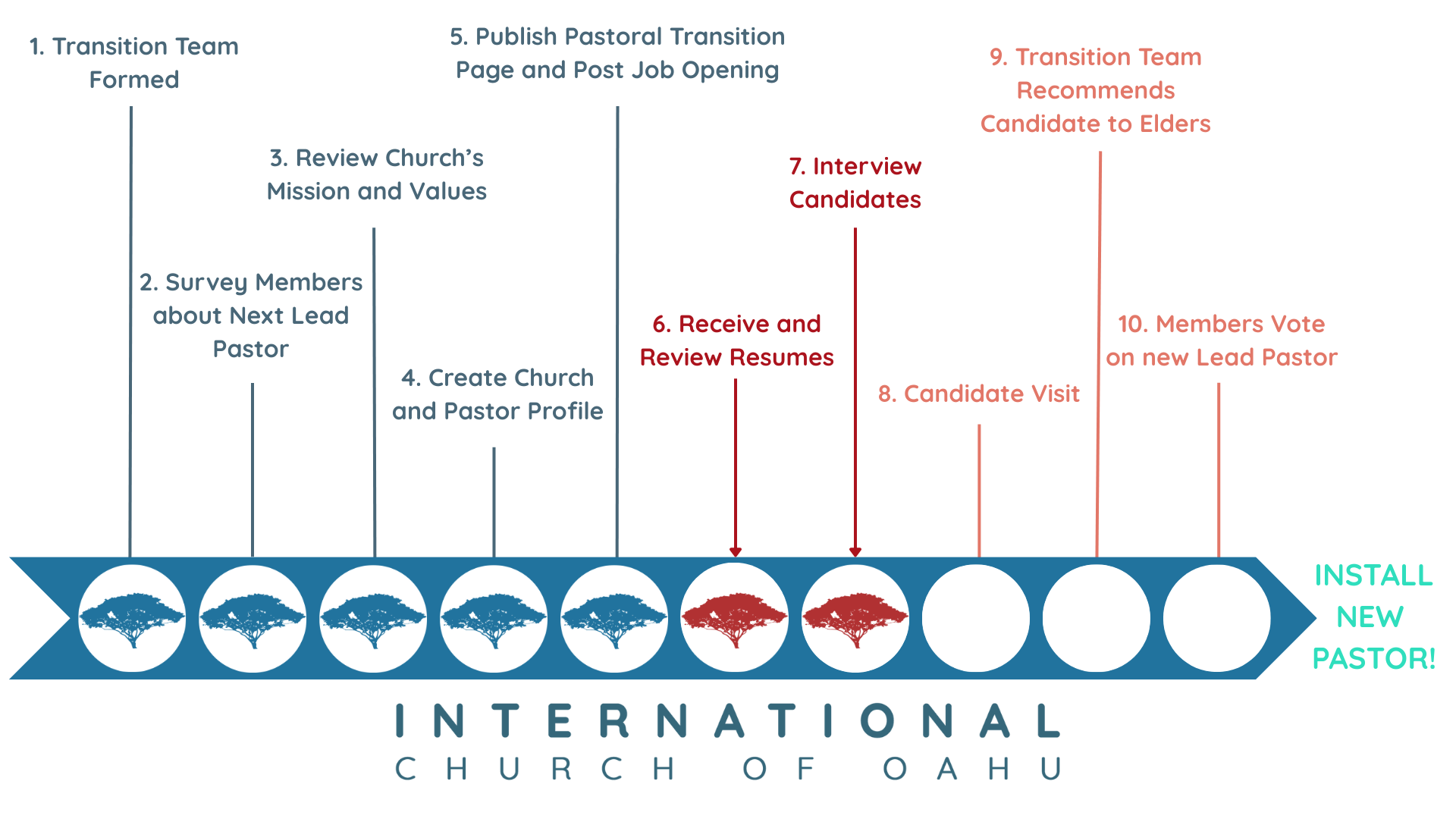 A dedicated Transition Team has been formed to oversee the selection process. They will review applications, conduct interviews, and prayerfully consider candidates to find the best fit for our congregation. After the candidate process is complete, and if approved by the Elder Board, this person will be voted on by the members of International Church.